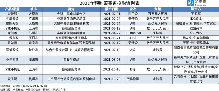 2020年至今,预制菜领域备受资本青睐,多家企业获得了融资,入局预制菜行业的投资机构包括青松基金、零一创投、东合资本、元璟资本、创新工场、星陀资本、清科资管、虢盛资本等。