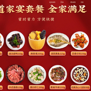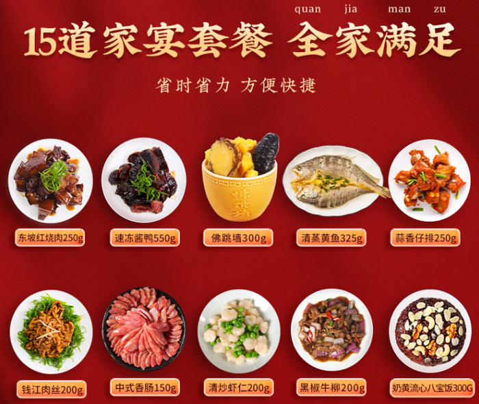 “年夜饭半成品套餐,14道家宴398元”“春节团圆饭私房预制菜,12道家宴298元”“宫保鸡丁、咕咾肉、老坛酸菜鱼、素什锦……年夜饭半成品8道菜248元”。