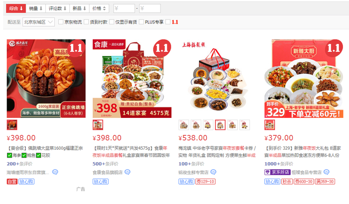 12月29日,新京报贝壳财经记者在各大电商平台上搜索“年夜饭半成品”“春节预制菜”等关键词,发现半成品预制菜销售火爆,一款“15道菜668元全家福半成品套餐”评价达2万+,好评度为97%。