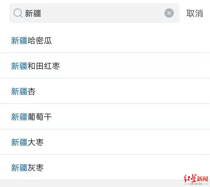 12月29日,红星资本局打开山姆会员店APP,在搜索栏输入“新疆”之后,下方会出现“新疆哈密瓜”、“新疆和田红枣”、“新疆杏”、“新疆葡萄干”、“新疆大枣”等选项;但无论点击搜索上述选项,还是点击搜索“新疆”,页面要么显示为其他相关产品,要么显示为“抱歉,没有找到相关商品”。