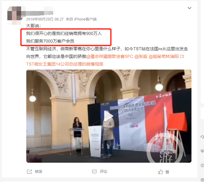 值得注意的是,上游新闻记者在疑似上海达尔威员工发的微博看到,“大哥说:我们很开心的是我们经销商拥有900万人,我们服务7000万客户会员。不管互联网经济,微商新零售在你心里是什么样子,如今TST站在法国从这里出发走向世界,它都应该是中国的骄傲@羅志祥國際歌迷會SFC @张庭 @庭秘密林瑞阳”。
