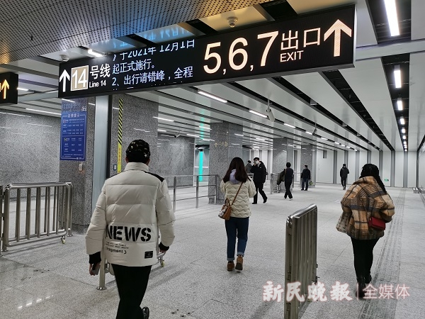 在曹杨路站,14号线可与3号线、4号线、11号线换乘。由于是“虚拟换乘”,乘客换乘时需出站。其间,地铁出入口间的地面最短距离就有500米左右,如果加上地铁出入口与检票口的距离,有700米左右。
