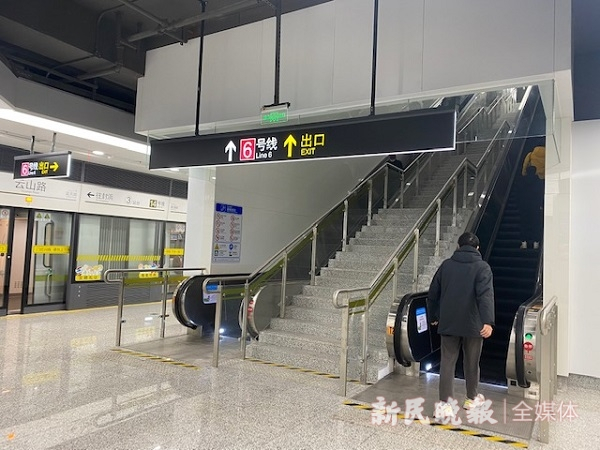继续乘坐14号线,两站后到达又一个换乘站——云山路,这里可以和6号线换乘。同样是站内换乘,云山路换乘站要走的路有点多,但因为标识很清晰,站台和通道里还有工作人员、志愿者,记者一路走来没有“踩雷”。乘坐电梯上行后,经过一段长长的通道,再上第二段电梯,然后继续向前步行,很快就看到了6号线的标识。但是在这里市民必须小心,要看清是往东方体育中心方向还是港城路方向,再选择从哪个楼梯下楼,走到站台。