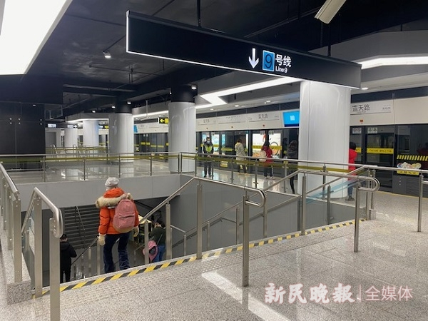 云山路的下一站蓝天路,是14号线换乘9号线的换乘站,这里和昌邑路站一样,仅需上下楼梯就能“秒换”地铁。