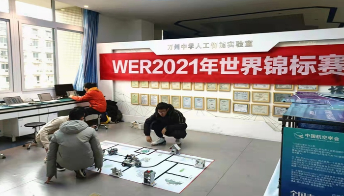 万州高级中学以科技课程为抓手,以国际前沿视野为推动力,坚持打造科技创新教育高地,在基础课程体系上日趋完备、丰富多彩。一是面向全校学生开设人工智能基础必修课,抓普及夯基础,面向全校学生开展模式识别、传感器、编程控制等内容的必修课教学;二是以社团为基础,开设人工智能、编程、机器人、模型、创客五大精品社团,针对特长学生进行分层教学、深入研究;三是整合校内外资源,借助万中大讲堂开展多元化科普活动,参观校内外科技场所,并开展校园科技节活动。同时,学校在科教设施投入上多点开花,2019年,创建人工智能实验室,配备重庆一流的硬件设施配备;2021年,开放中学生物组织培养实验室和西南地区首个航空航天主题校园科技馆。