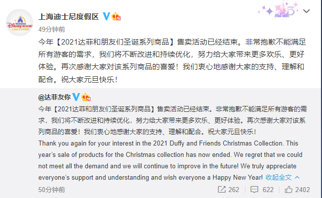 ↑12月29日晚,上海迪士尼度假区发布消息称,今年2021达菲和朋友们圣诞系列商品售卖活动已经结束。