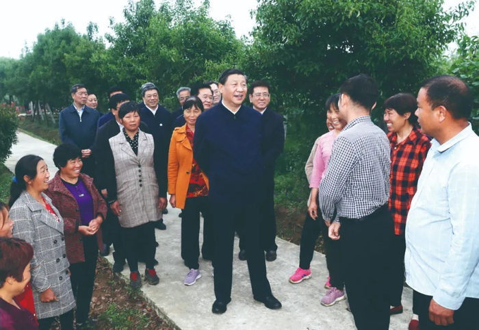 2021年5月13日,习近平在河南南阳市淅川县九重镇邹庄村考察利用南水北调移民村产业发展资金建立起来的丹江绿色果蔬园基地,同村民亲切交流。 新华社记者 王晔摄