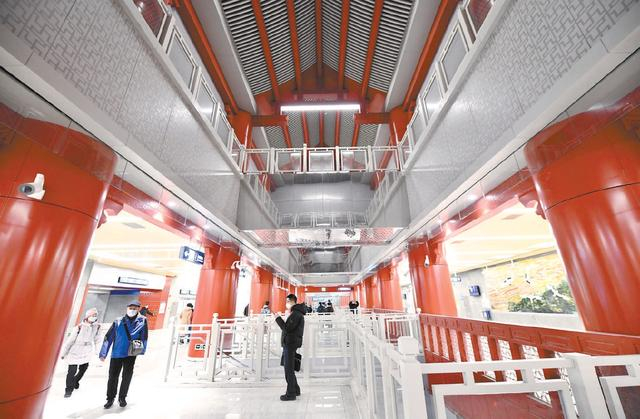 8号线作为“地下中轴线”串联由北至南诸多北京文化地标,新开通的金鱼胡同站、王府井站和前门站更是充满艺术气息。本报记者 和冠欣 摄