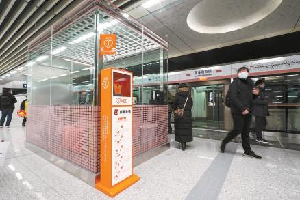 14号线丽泽商务区站的AED装置摆在了显眼的位置。今年新开通线路都配置了自动体外除颤器。 本报记者 程功 摄