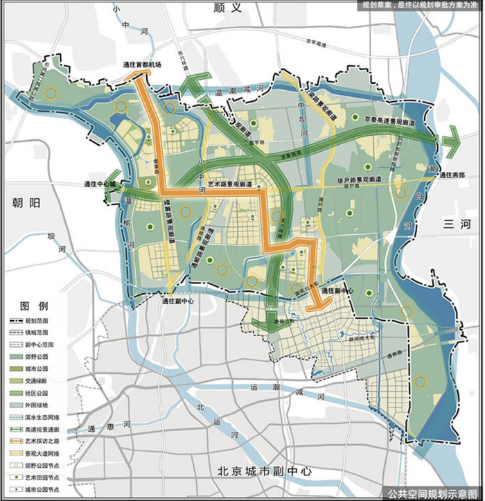 在空间布局上,规划草案提出,构建“两带、两区”的城乡空间结构。其中,“两带”为依托大运河生态文明带延长线建设温榆河国际交流带,沿北三县交界地区建设潮白河生态休闲带,“两区”则是以小堡画家村为基础建设小堡艺术区,以及以徐辛庄轨道交通枢纽和镇中心区公共服务职能为基础,在宋庄镇中心区引入综合服务、商务服务、文化创意等功能。