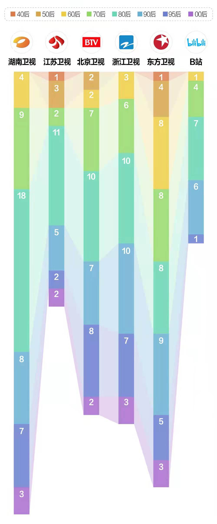 6家平台演出嘉宾年龄层分布统计: