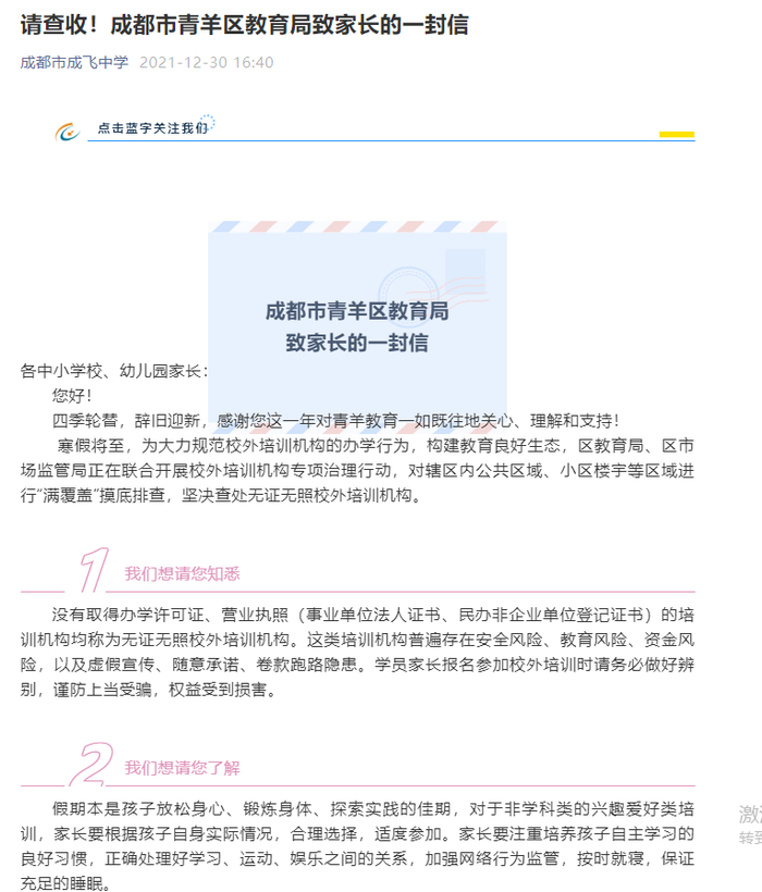 12月30日,成都市青羊区不少中小学的官方微信都向家长推送了一则消息——《@家长朋友,青羊区教育局致家长的一封信请查收》。信的内容为:寒假将至,为大力规范校外培训机构的办学行为,构建教育良好生态,区教育局、区市场监管局正在联合开展校外培训机构专项治理行动,对辖区内公共区域、小区楼宇等区域进行“满覆盖”摸底排查,坚决查处无证无照校外培训机构。