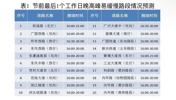 本周五是节前的最后一个工作日、也是今年最后一天,在下班通勤、休闲出行、短途周边游等客流高峰叠加作用下,当日交通压力明显增大,预计15时前后中心城区车辆明显增多,17时30分—19时期间中心城区或将持续处于“严重拥堵”等级,当日晚高峰拥堵指数或较普通工作日增加一成。局部交通方面,内环路、广州大道中、猎德大道、黄埔大道、东风西路等市内主要干道,广园快速、科韵路、华南快速干线等进出城重要通道车流较密集,局部路段车行缓慢。