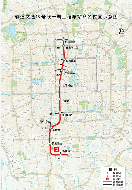 19号线一期——新宫、新发地、草桥、景风门(暂缓开通)、牛街、太平桥(暂缓开通)、平安里(暂缓开通)、积水潭、北太平庄(暂缓开通)、牡丹园