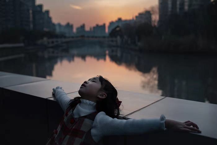 2021年12月4日,小女孩在苏州河边的公园玩耍。