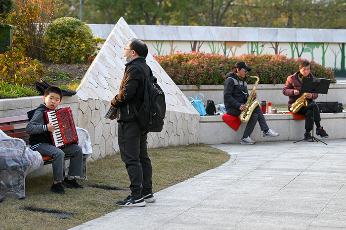 2021年12月4日,苏州河武宁路桥,三年级高同学在爸妈的陪同下在练习手风琴。“在这里练习很开心,不会吵到别人,还可以看到河边的风景。”