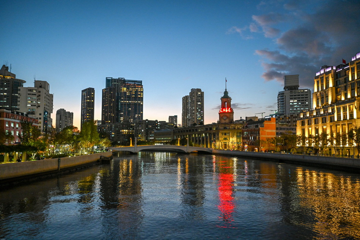 2021年11月18日,乍浦路桥,夜幕下的苏州河,在灯光的映衬下,改造后的北苏州路滨河空间美轮美奂,远处是邮政博物馆。