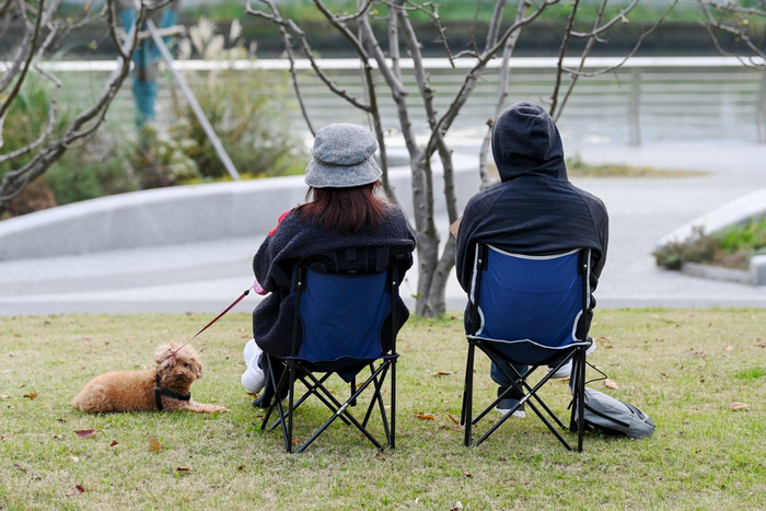 2021年12月25日,蝴蝶湾,两位老人在苏州河河边步道遛狗。