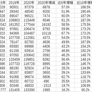 相比之下,近十年增幅最小的三个行业分别是金融业,住宿和餐饮业,租赁和商业服务业。这其中金融业近十年工资增幅最小,只有90.2%,是唯一一个增幅低于100%的行业。其次是住宿和餐饮业,近十年增幅只有108.8%,尤其是2020年,该行业在疫情的冲击下,从业人员平均工资减少了1513元。