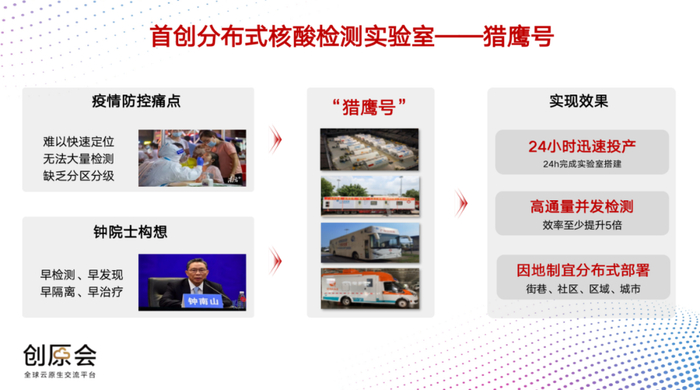 面对疫情防控难以快速定位、无法大量检测、缺乏分区分级的主要痛点,在钟南山院士主持下,广州实验室、金域医学等机构联合研发,推出业内创新的“猎鹰号”移动方舱实验室。