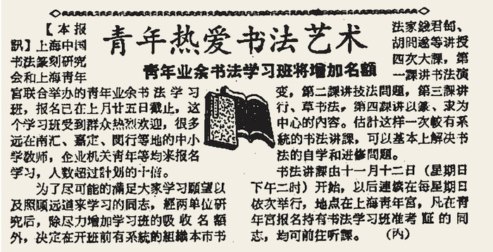 《新民晚报》1961年11月6日第2版,《青年热爱书法艺术,青年业余书法学习班将增加名额》