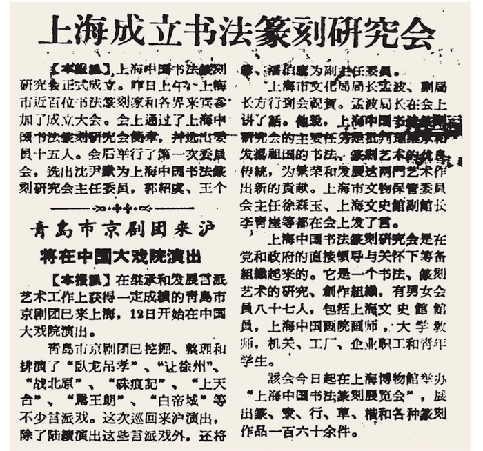 在沈尹默等老一辈书法家为传承和弘扬中国传统书法艺术的热情呼吁中,1961年4月8日,上海市书法家协会前身上海中国书法篆刻研究会正式成立,标志着新中国首个公立书法类社会团体在上海诞生。