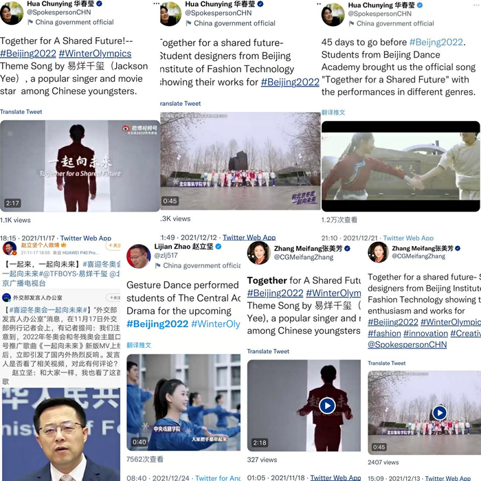 中国外交部部长助理华春莹和中国驻贝尔法斯特总领事张美芳也先后两次在个人推特上,对MV及北京服装学院师生身着国家重大活动设计服装的传唱视频进行重点推荐。12月25日,华春莹再度推荐了北京舞蹈学院传唱视频,显示了其对全民传唱活动的持续关注。