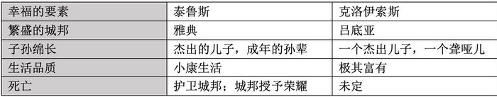 这四点简要总结就是“生得伟大,死得光荣”,如果再加一句就是“子孙绵长”。泰鲁斯作为梭伦眼中最幸福的人,实际上并不是什么非凡的人物,他既非史诗中的英雄,也非政治家或者大智大慧之人,就连资产也是普通水平,总体而言就是一位普普通通的雅典公民。