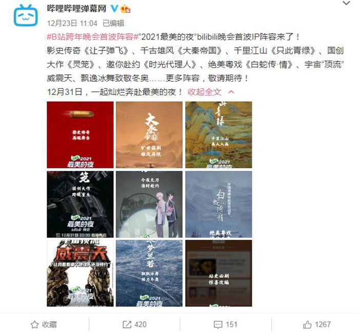 2019年末,B站的跨年晚会将《哪吒之魔童降世》《哈利波特》《亮剑》等爆火IP融入其中,获得全网刷屏。这也让很多人意识到,在竞争激烈的跨年夜比拼中,创意可能比明星阵容“更好用”。
