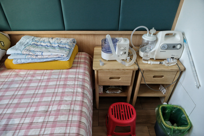 在奕奕十平米左右的房间里,最多的东西是药品和处方奶粉,两个并排的床头柜上,分别摆着每天都要使用的雾化器和吸痰器,这些物品,仿佛是奕奕迄今为止的人生缩影。