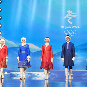 “瑞雪祥云”的设计以“瑞雪”、“祥云”两个中国传统吉祥符号为主题,色彩运用天霁蓝和霞光红,将中国传统的交领右衽、对襟旋袄与现代服饰相结合,提炼冬奥核心图形元素的同时将中国传统绘画中“金碧山水”的技法转化为刺绣的形式,礼服整体以现代简约的手法展现中国韵味。赛时将出现在所有雪上场馆的颁奖仪式中。