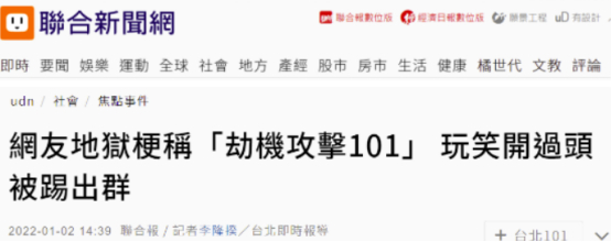 “联合新闻网”称,据台北警方调查,一网友1日晚在lINE社群“梗到下地狱大家庭”中匿名留言,原本跟其他网友一样大开“地狱梗”玩笑,但其提及“劫机”“攻击台北101”等字句,被认为玩笑开过头,随即被管理员踢出群组。