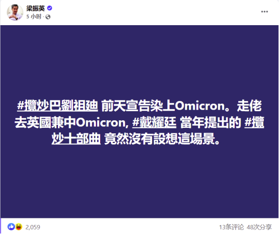 刘祖迪的帖文一出,就引来全国政协副主席、香港特别行政区前行政长官梁振英的嘲讽,他今日(2日)在脸书发文称,刘祖迪前天宣告染上奥密克戎,“走佬去英国兼中Omicron,戴耀廷当年提出的‘揽炒十部曲’竟然没有设想这场景”。