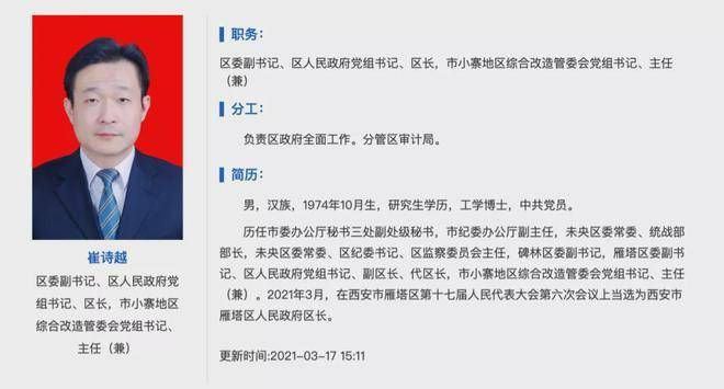 王斌履新的同一天(2021年1月7日),崔诗越任西安市雁塔区委委员、常委、副书记。