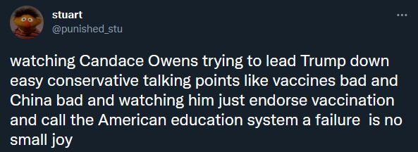 社交媒体上,很多反对保守派的网民,纷纷对坎蒂斯“吃瘪”的表情津津乐道。“看到坎蒂斯想引导特朗普说些简单的保守言论,比如疫苗不好,中国不好,但特朗普却说他支持疫苗,美国教育系统失败,这是不小的乐子。”