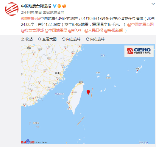 台湾花莲县海域发生6.4级地震,震源深度15千米