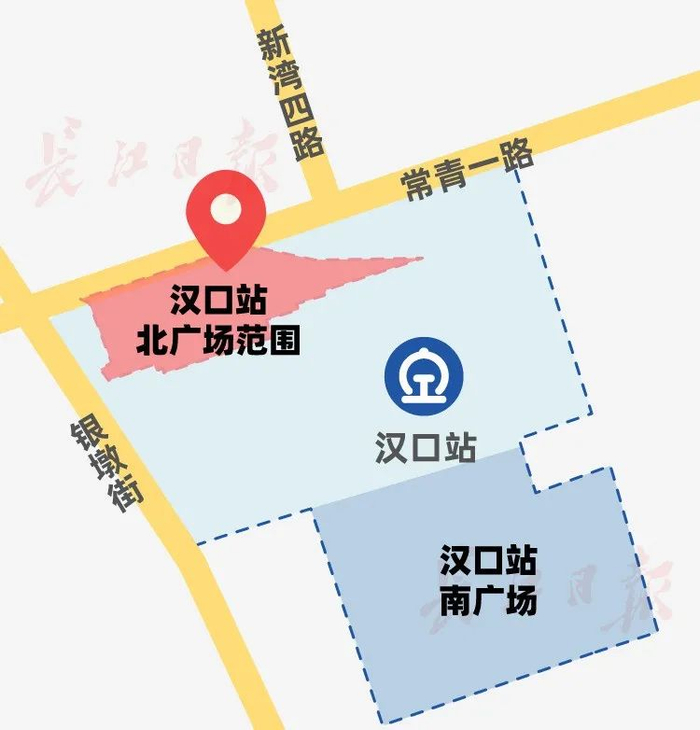 目前,汉口火车站北广场正在加紧建设中,预计2022年竣工投入使用,在汉口火车站北广场建设同时,还将对周边常青一路与银墩街交叉口进行改造,对银墩街车行道进行拓宽。