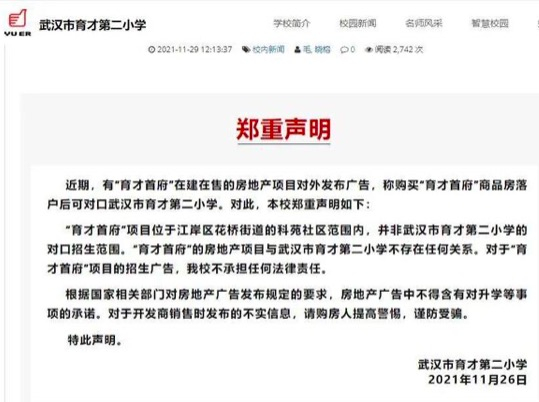 该广告指向的武汉市育才第二小学公开发布辟谣声明,直指该房地产项目与学校不存在任何关系,“对于开发商销售时发布的不实消息,请购房人提高警惕,谨防受骗”。