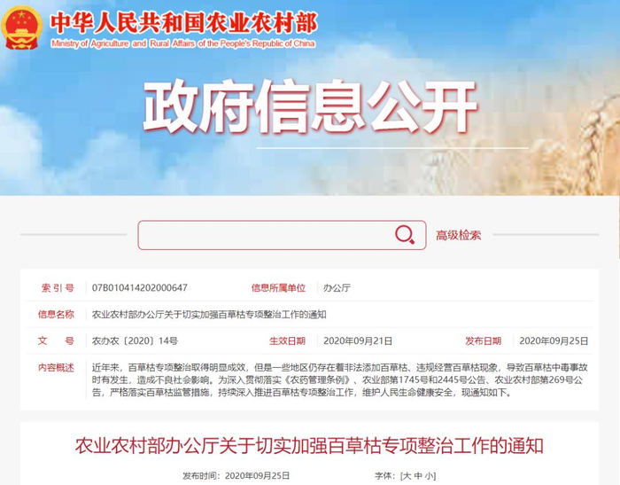 2020年9月25日,农业农村部办公厅发布《关于切实加强百草枯专项整治工作的通知》。