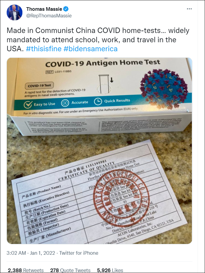 值得一提的是,美国众议员托马斯·马西(Thomas Massie)于2021年12月31日也在推特上发文“抱怨”美国广泛授权使用的都是中国产的试剂盒。当时有网民回怼他:“有什么问题吗?在美国很多能买到的东西都是中国制造的。”