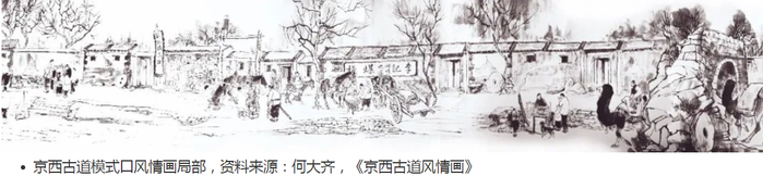 明清之时,模式口为镇级行政聚落,地理位置独特,依山傍水,地险易守,故派千总加以镇守。模式口有三里长街,店铺众多,东接京城,西有“驼铃古道”,时有驼队与马队穿行而过。它还是一条古老的香道,清代及民国时期每年农历四月初一至十五,门头沟妙峰山都举办盛大庙会,香客众多,通过模式口去妙峰山进香的香会有百余档,人来人往,甚是繁盛。