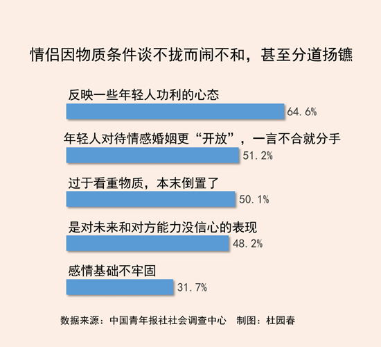 原标题:情侣因物质条件谈不拢而分手:64.6%受访青年认为是心态太功利