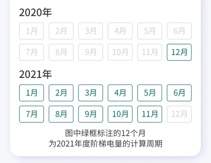 而2021年12月,既不在原来阶梯电量计算周期内,也没有纳入新的和“自然年”相对应的计算周期,该月实际用电量按照年度阶梯总电量执行,即居民用户当月内实际使用电量不超过3120度,执行第一档阶梯电价;累计用电量大于3120度且不超过4800度,执行第二档阶梯电价;超过4800度则执行第三档电价。