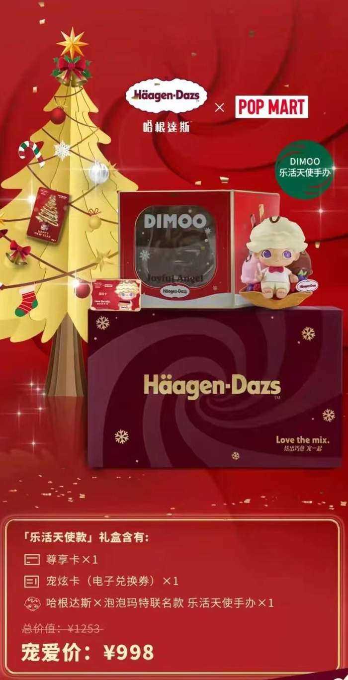 反观去年圣诞,哈根达斯就曾联合泡泡玛特推出圣诞款Dimoo手办,限量4000份。不过上次联名活动并未引发大规模的热度。小蔡认为这一方面与发行量不高有关,另一方面也与售价有关,2021哈根达斯圣诞活动款礼盒中包含两张卡券与一款Dimoo手办,售价998元。与之相比,售价99元一份的肯德基套餐就显得更加亲民。