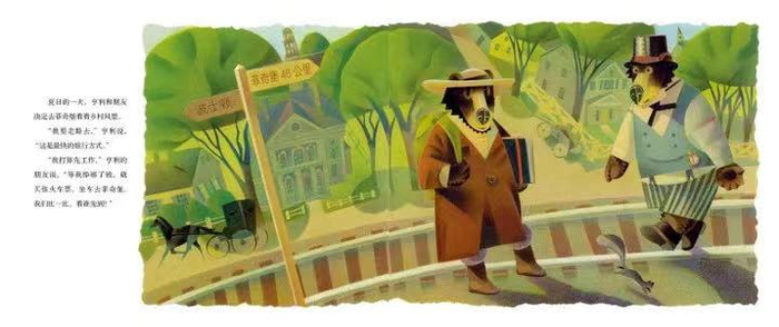 比起“菲奇堡”工整的绘图,“去爬山”的色彩更鲜明,构图更具动感,情感更饱满,亨利硬挺挺的络腮胡造型似乎也更亮了。我常想,商业化气息浓厚、充满务实精神的美国出现了不少杰出人物,何以大家要把这位遗世独立的“刺儿头”梭罗尊为精神基石呢?也许因为他居于现实的另一端,有了他,美国人的内心才会达到微妙的平衡,一如老子留给了拘谨的东方人任性潇洒的生活态度。这种矛盾或许能使人保持活力,让那些好好工作的“D.B.约翰逊们”在心中一直留着一份念想,也潜藏着一股劲儿,不致被现实完全吞噬。梭罗会时刻提醒我们:你也一直想着去森林徒步吗?