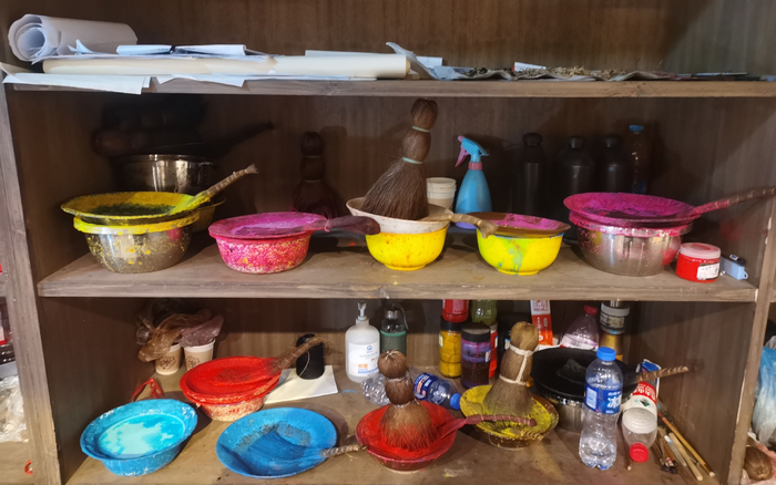 武强年画博物馆里的各色颜料。新京报记者 王颖 摄