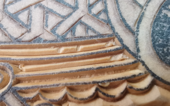刻完的线条并非直上直下,而是梯形的,这样有利于印刷。一块版刻成后,可以印1万到2万张。如果线条直上直下,很容易磨损断裂。
