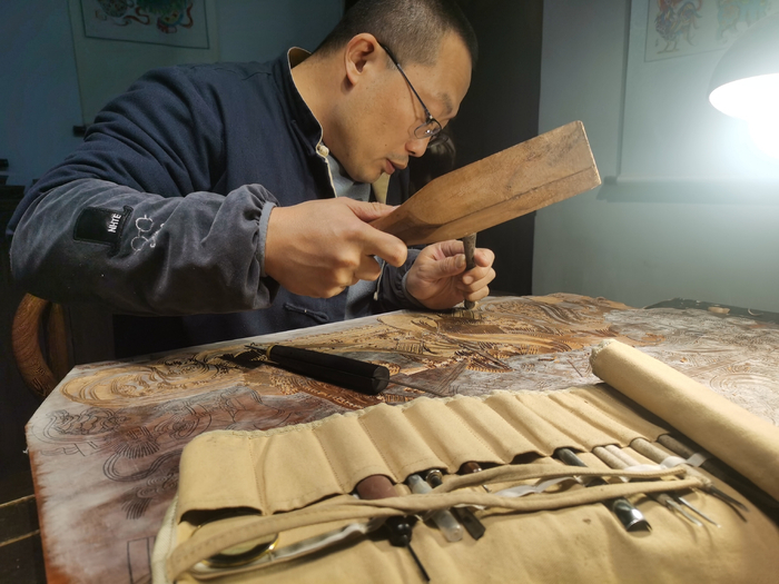 锋利刻刀划过坚硬的杜梨木,一条完整的线条被刻意划出了一个缺口。“这样就和古版一样了,”辛艳君放下了手里的刻刀。