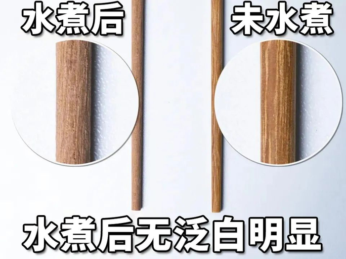 再把煮过的筷子和没煮过的筷子做对比,木筷子明显泛白,表面都是毛刺。