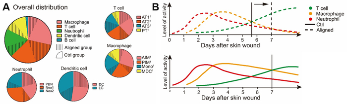 材料周围免疫微环境构成情况。A:免疫细胞构成情况;B:取向材料促使免疫进程向适应性免疫推进